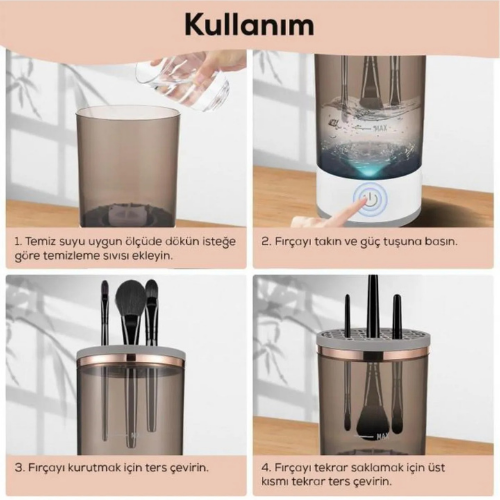 Genellikle 1–2 dakika içinde fırçaların tertemiz olur. Zaman kaybetmeden makyajına devam edebilirsin.
